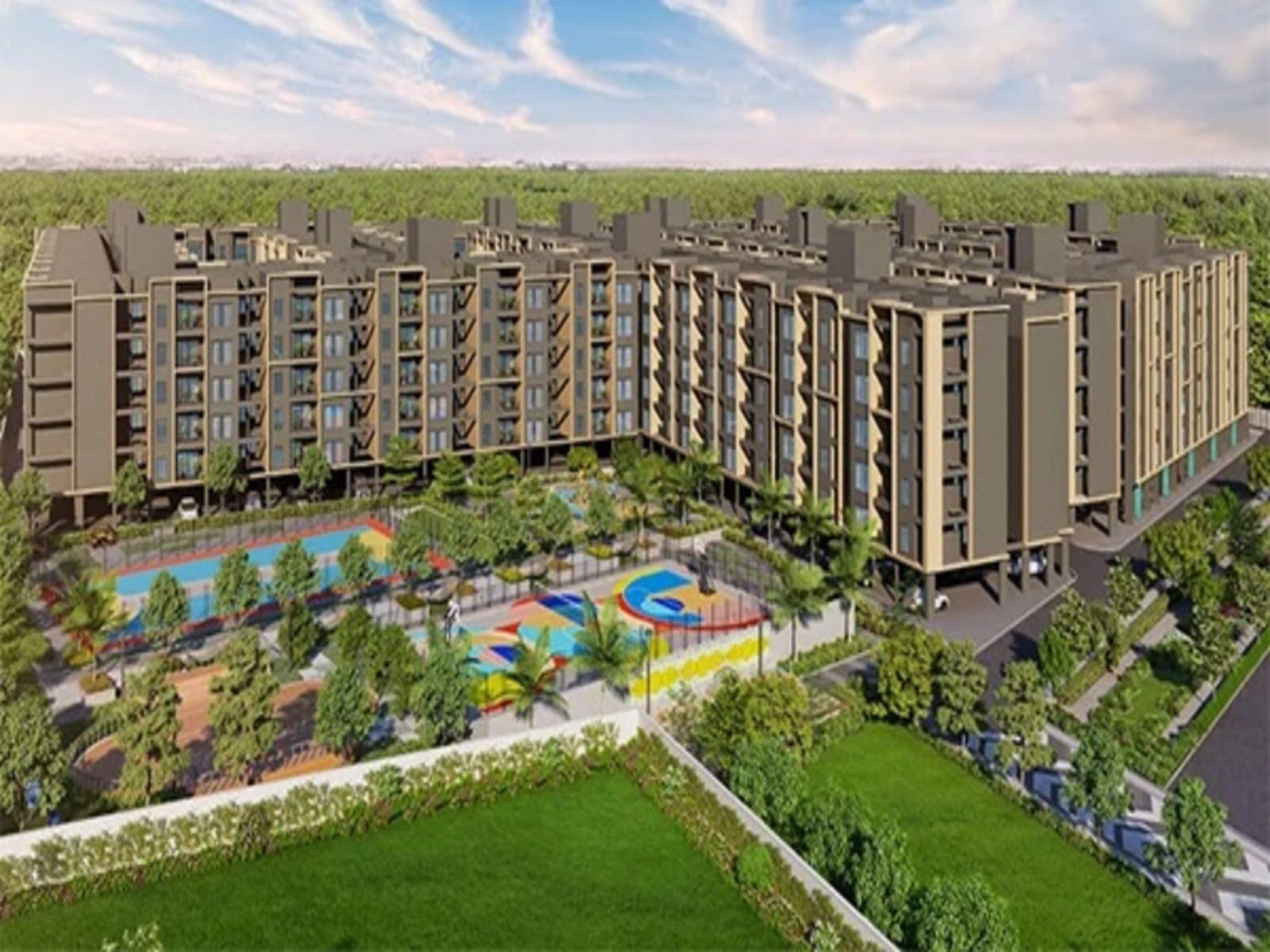 - Offers 156+ amenities like bocce ball, box cricket, beach, volleyball court, multi-purpose court, half-Basketball court