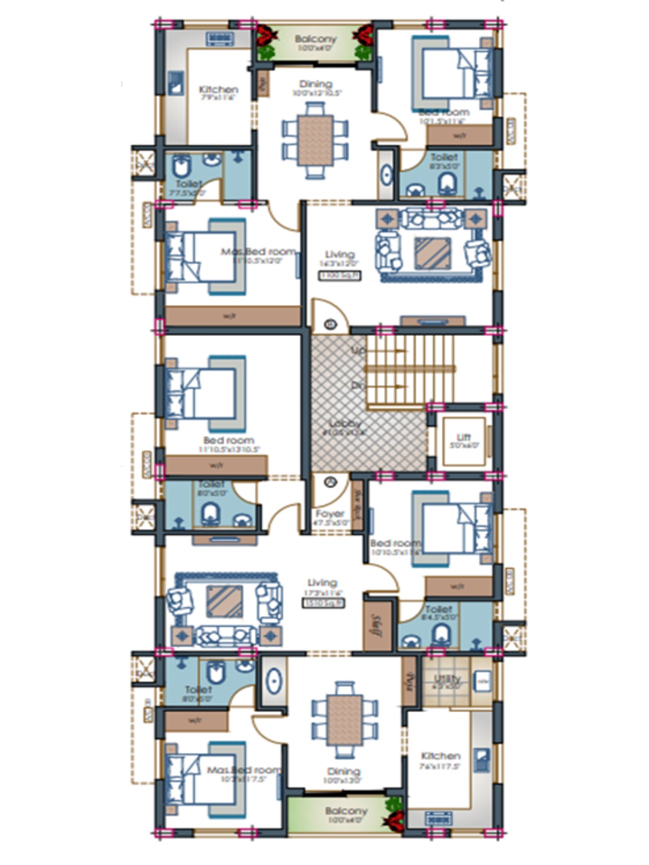 - The project features amenities like a lobby with elegant seating on stilt floor. power backup, and covered car parking.